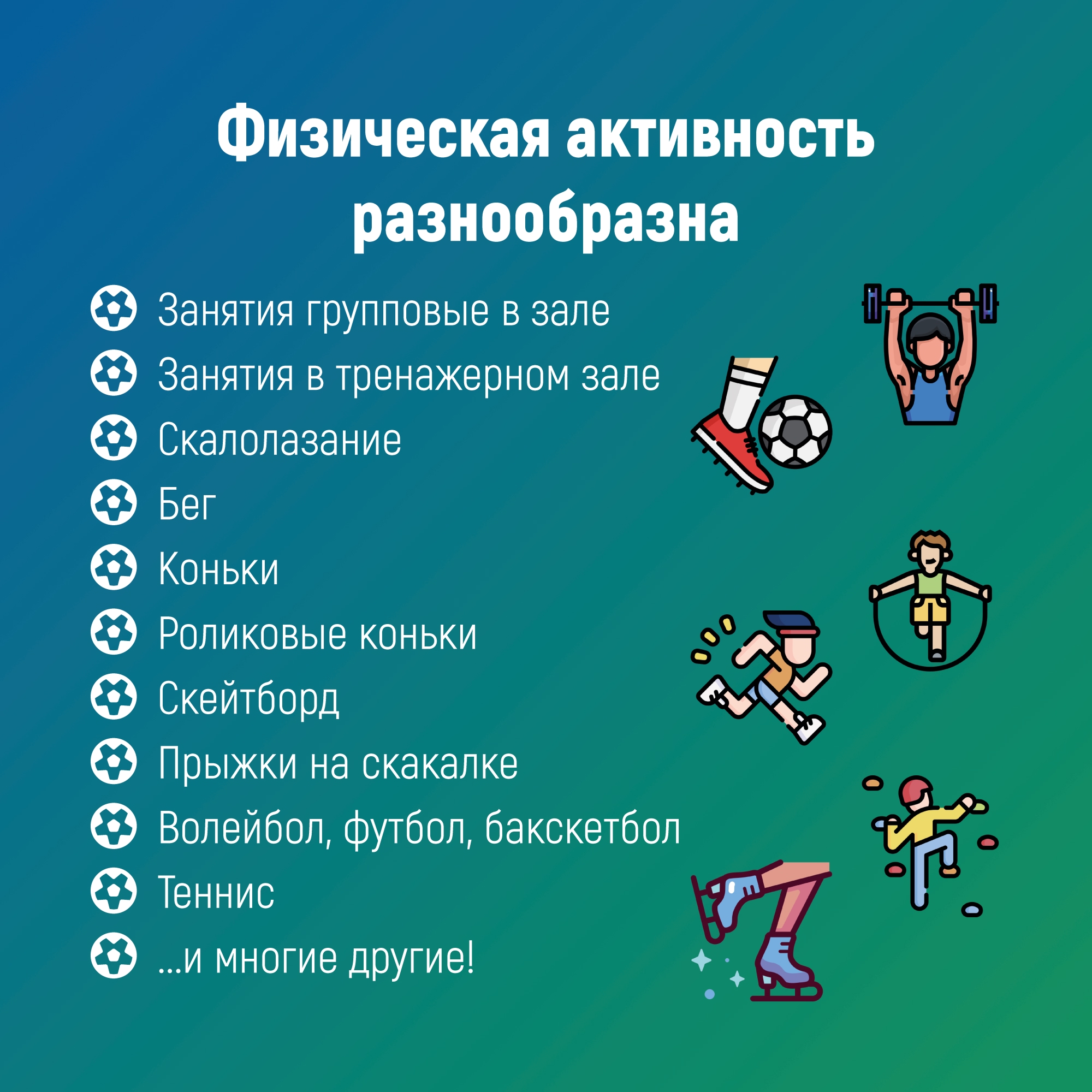 Вы удивитесь, насколько разнообразной может быть физическая активность — каждый сможет найти занятие по душе. А ещё мы расскажем, как спорт влияет на организм, какие существуют простые правила для безопасных тренировок и как сделать физическую нагрузку частью повседневной жизни.